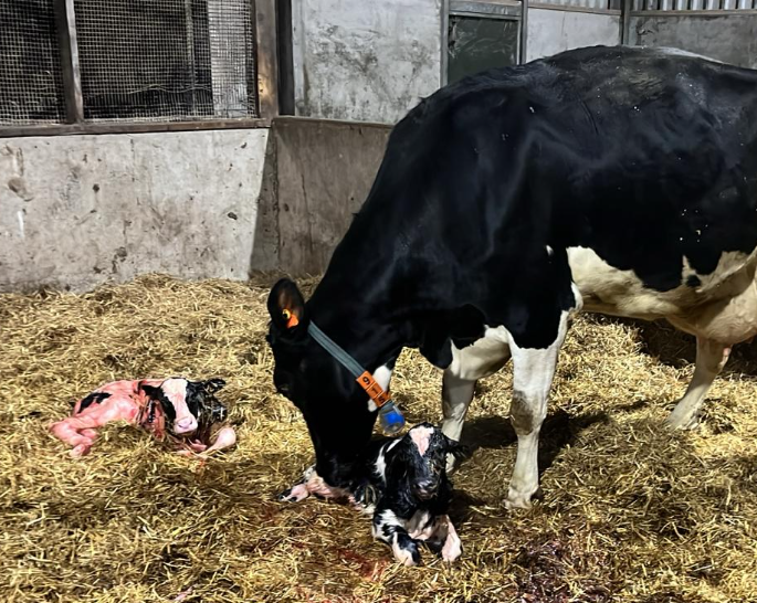 Het kalfje is geboren, niet veel later wordt er nog een kalf geboren. Een tweeling is de verklaring van de normale geboorte én een stuitligging. Gelukkig met een goed resultaat: twee gezonde kalveren.