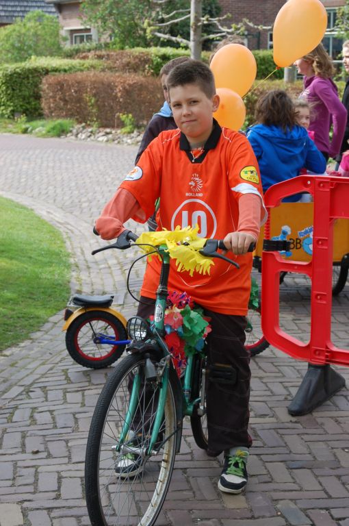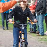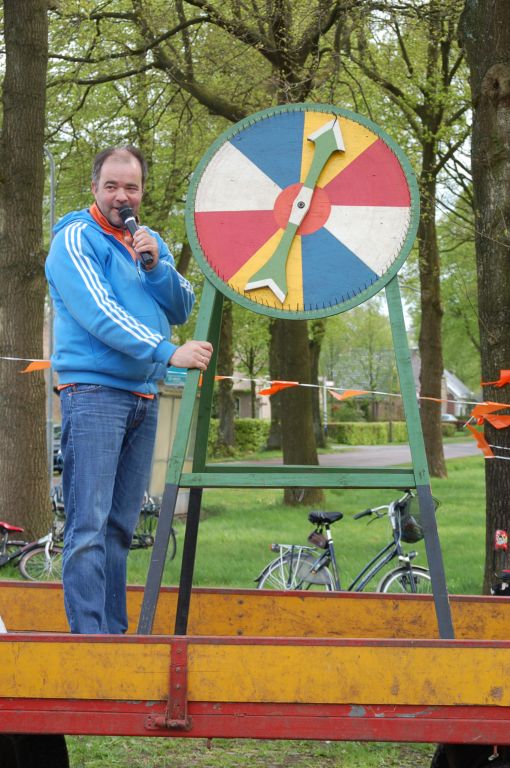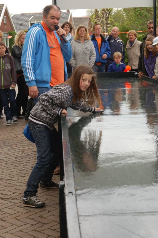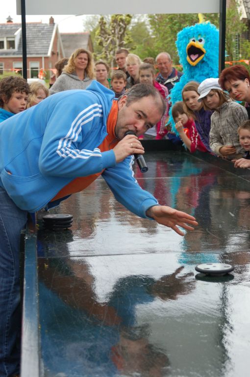 Hierna stond een leuk vermaak voor jong en oud op de agenda. Nou dat klopte, iedereen vond de sjoelbak van 30 meter (!!!) leuk. Dit bleek wel uit de vele deelnemers die inderdaad qua leeftijd varieerden van jong tot oud. Tussendoor kon je meedoen aan de prijsvraag "hoeveel veren heeft Pino" en aan het rad van fortuin waar leuke prijsjes te winnen waren. Verder konden de kinderen ook nog touwtje-trekken. Als afsluiter de traditionele "hap 'm d'r oaf", waaraan verscheidene kinderen meededen. De een had de fiets iets meer versierd dan de ander maar het enthousiasme was allemaal even groot.