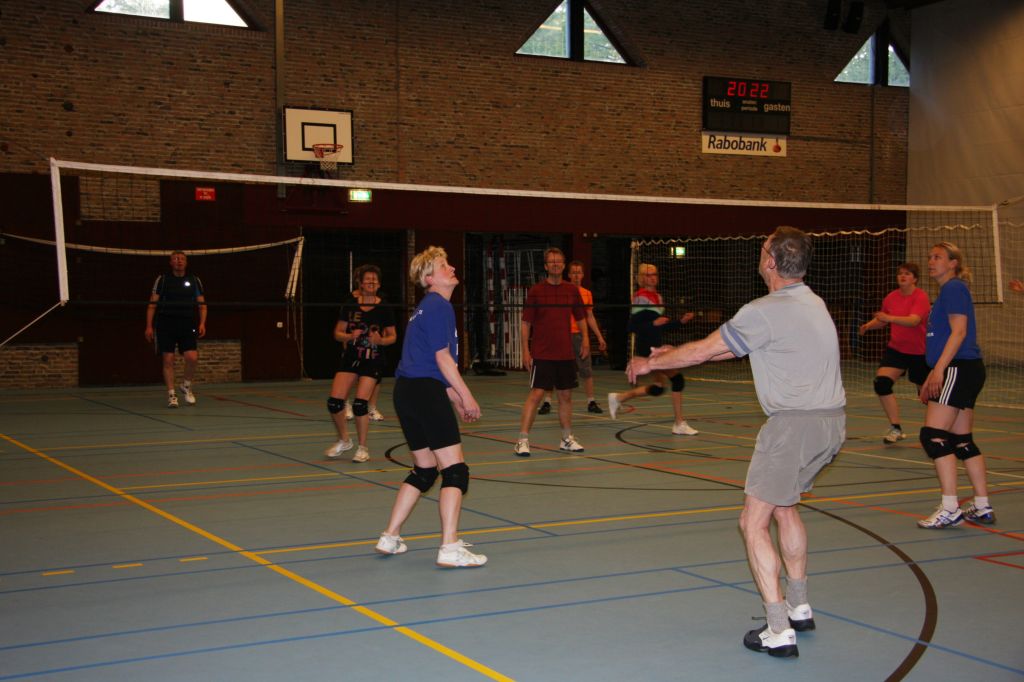 Van de aanwezigen konden 4 teams worden gevormd, die in een onderlinge competitie nog even lekker hebben gevolleybald. Daarna was het nog even nazitten in de Brinkhof, wat goed verzorgd was met lekkere hapjes. Al met al een gezellige afsluiting.