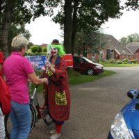 Verder was de organisatie erg verrast door de spontane individuele actie van Vera, zij heeft zich laten sponseren door familie en vrienden en verzamelt daarmee zo rond de € 400,--. Zij had zich speciaal hiervoor uitgedost als clown en fietste zo ook de route. Zo'n initiatief vinden wij natuurlijk geweldig. Vera, chapeau!