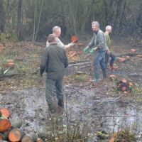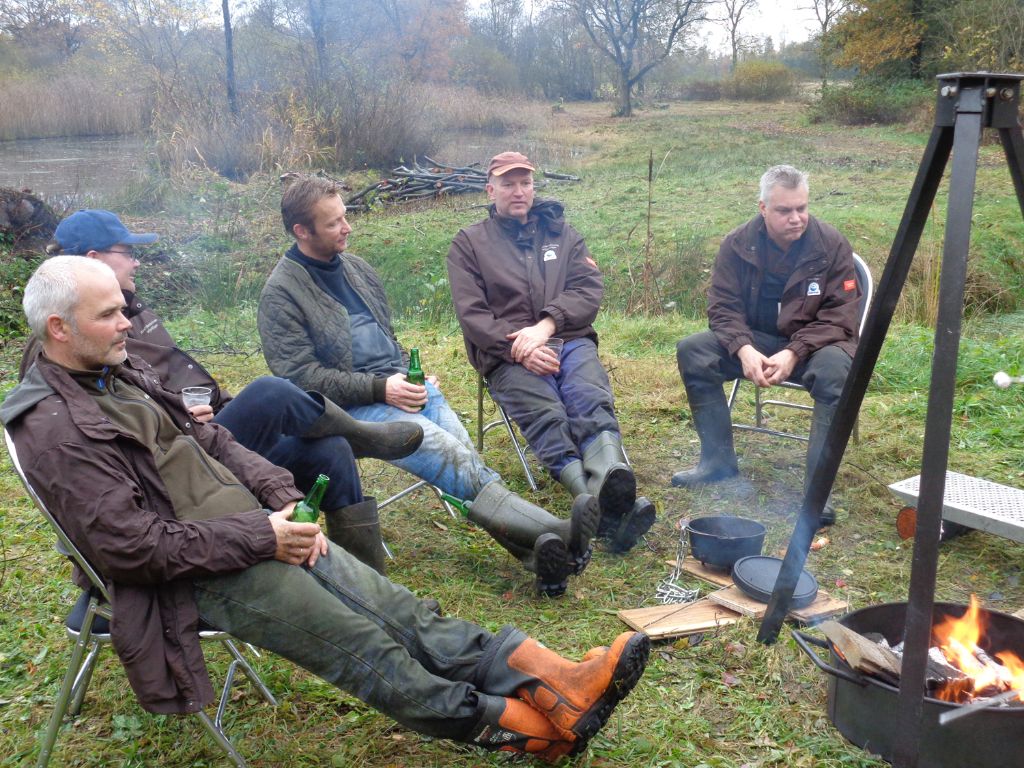 Tussen de middag was er een prima snert-maaltijd met roggebrood met spek, verzocht door hotel Karsten uit Norg en muzikaal opgevrolijkt door Hendrik Pieters. Voldoende aangesterkt hebben de vrijwilligers daarna nog een hoop houtige opslag uit het veentje en de randen gezaagd om te voorkomen dat het veentje dicht gaat groeien.