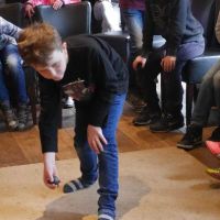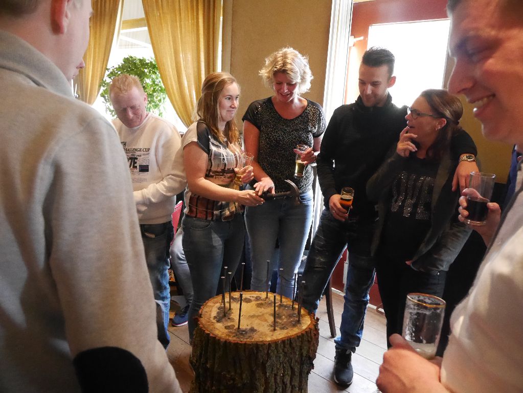 Maar eerst kwamen de eieren met krentenbrood op tafel en iedereen liet zich dat bijzonder goed smaken. Ook het grote blok eikenhout kwam in de zaal te staan zodat iedereen zijn spierballen ook nog even kon laten zien om de spijker in zo weinig mogelijk slagen in het hout te laten verdwijnen.