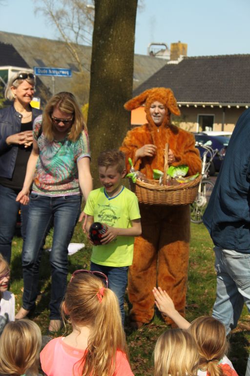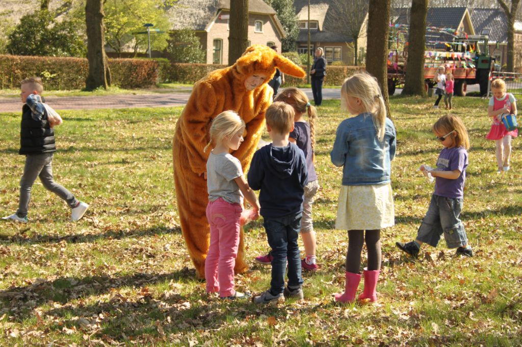 Ondertussen kwam de paashaas langs om alle eieren te verstoppen op de brink. Verdeeld in 2 groepen gingen de kinderen in de weer om alle eieren te zoeken. De oudste kinderen gingen naar de achterste brink om daar naar eieren te zoeken. En de jongste kinderen hebben eieren gezocht op de brink voor Café Hingstman. En dat zoeken viel niet altijd mee…. het is best lastig zo’n bruin ei vinden tussen het bruine dorre eikenblad… En die gekke paashaas had ze ook nog in bomen verstopt….
