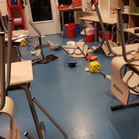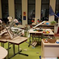 De deuren van de school zaten nog dicht, maar door de ramen heen konden de kinderen de enorme chaos in de klassen zien....Rommelpiet was in die nacht op bezoek geweest en had zijn naam eer aan gedaan. Overal lag van alles door elkaar en niets stond meer op zijn plek. Gelukkig konden de kinderen alles in razend tempo weer opruimen en vonden ze onder de rommel ook nog eens iets lekkers in hun schoentjes.