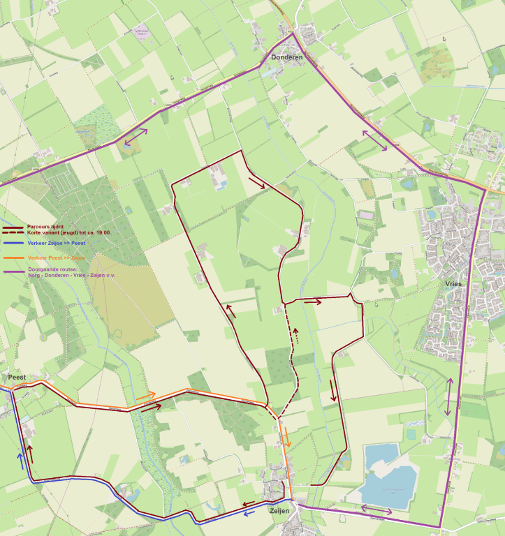 - Doorgaand verkeer tussen Zeijen en Donderen kan gebruik maken van de route via Vries en Ubbena