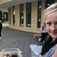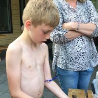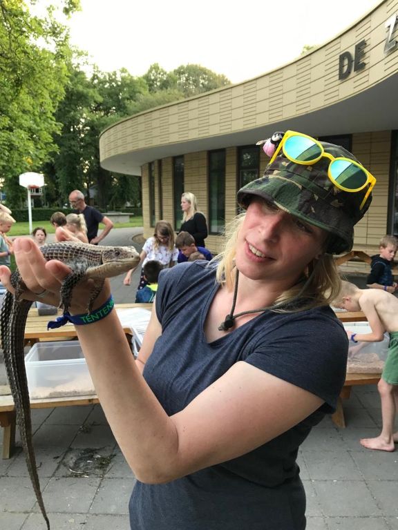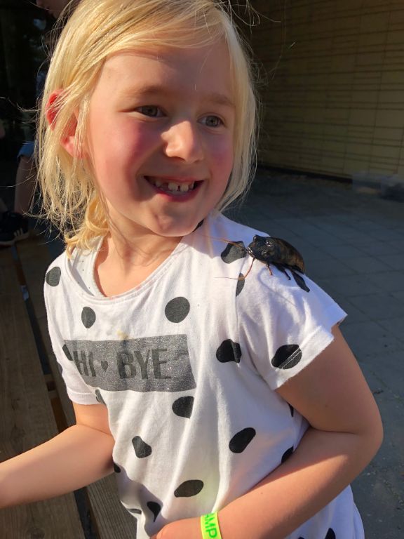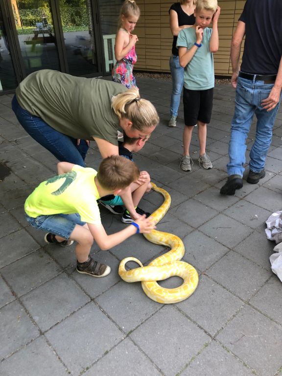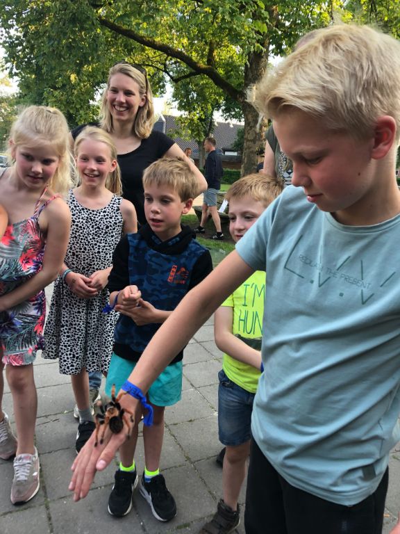 Rondom het MFA waren allemaal leuke spelletjes opgesteld, bedacht door Ilse Hartlief. In de knoop uit de knoop, waterballonnen dart en hoe snel kun je een parcours lopen met een pingpong bal op de lepel. Maar het ALLER ALLER spannendste was toch de jungleman! Hij had allerlei beestjes bij zich. Slangen, spinnen, kakkerlakken uit Madagaskar en nog meer.......