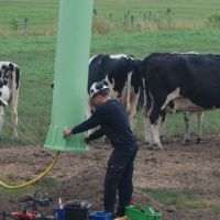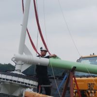 Vandaag is de nieuwe windmolen geplaatst bij Gerko en Elly Brink. Onder toeziend oog van de wethouder René Kraaijenbrink werd de molen van de firma EAZ Wind uit Hoogezand geplaatst. In combinatie met 140 zonnepanelen moet hiermee de energiebehoefte van de boerderij gedekt zijn. De zonnepanelen worden later in het jaar nog geplaatst. De molen is 15 meter hoog en het tipje van de wieken bereikt 21 meter. Hiervoor was een aanpassing van het bestemmingsplan nodig. Dat kon gelukkig allemaal met de gemeente geregeld worden. Vanaf vandaag draait de molen en wordt op jaarbasis 26.000 KWh opgewekt. De molen wordt gerealiseerd zonder subsidie en is toch in zo'n 8 jaar terugverdiend. Dat is toch een mooie prestatie. Opvallend zijn de houten wieken, deze zijn milieuvriendelijker dan de gebruikelijke plastic wieken.