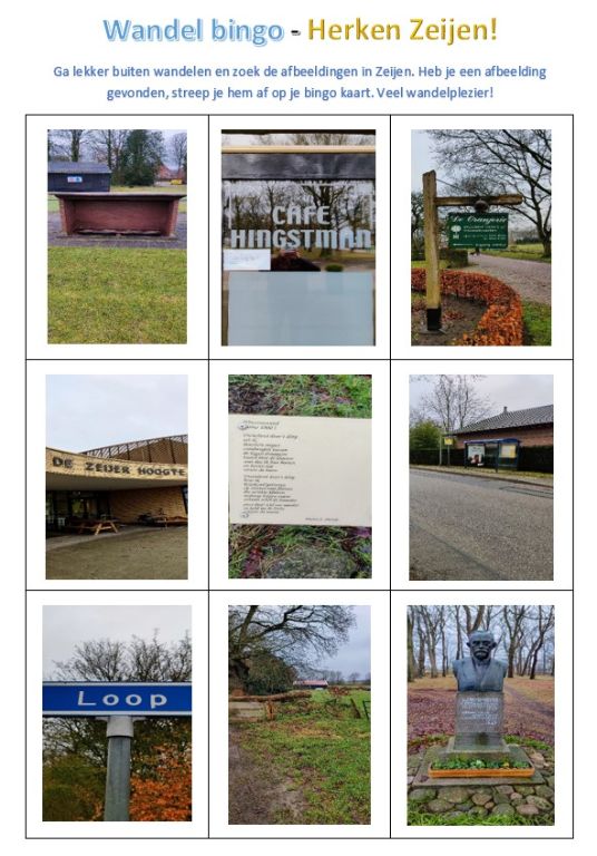 OBS De Zeijer Hoogte heeft 2 geweldige bingokaarten gemaakt, waarmee de kinderen uit onderbouw en bovenbouw een uitdagende wandeling door Zeijen kunnen maken. Omdat de bingokaarten een groot succes waren, deelt de school ze nu met alle inwoners zodat iedereen er gebruik van kan maken. De eerste kaart is gemaakt voor de onderbouw, de 2e kaart voor de bovenbouw kinderen. Heel veel plezier bij de wandelingen.