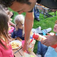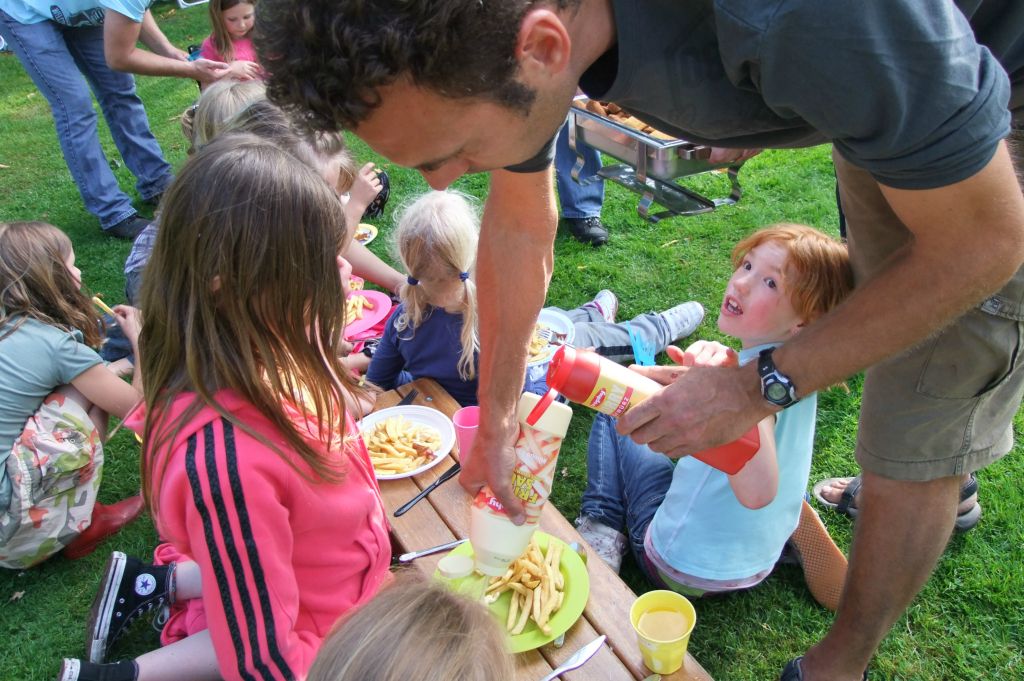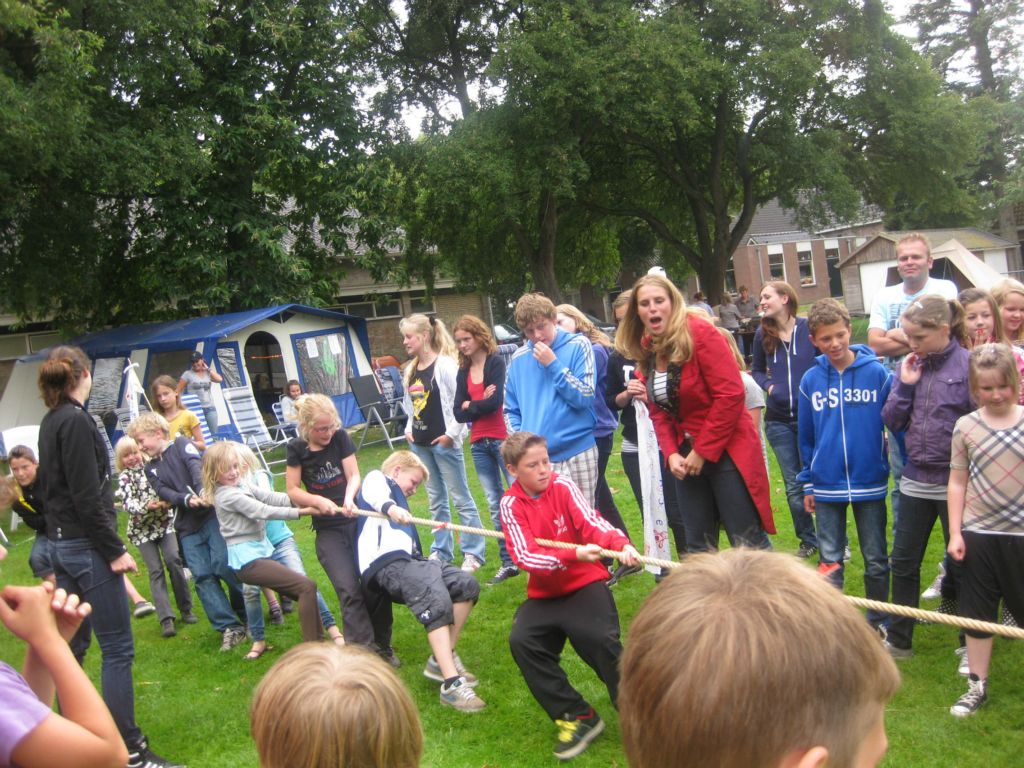 De catering kwam en we gingen heerlijke patat met frikandel eten van Hingstman. Als toetje hadden we heerlijke knetter ijsjes, blauwe ijsjes, dropijsjes en ijsjes met fluiten. Dat hebben we geweten, een mooi fluitconcert hebben we gehoord. Gauw verder met het kampioenschap touwtrekken. Het ging er hilarisch aan toe, maar uiteindelijk ging de groep van Selmar en Irene er met de overwinning vandoor.
